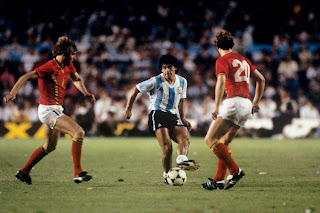 Argentina' s Diego Maradona (c) plays a pass despite