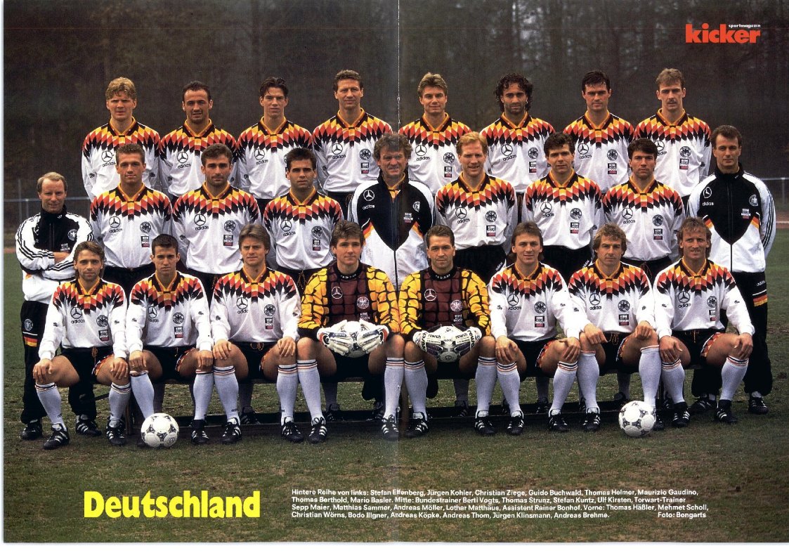 Michael Tarnat, Dietmar Hamann, Markus Babbel, Mario Basler, Thomas Helmer; Front, l. t. r. Giovane Elber, Oliver Kahn, Christian Nerlinger, Mehmet Scholl, Bixente Lizarazu, Lothar Matthäus