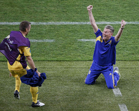 Ukrainian forward Andriy Shevchenko (L) embraces Ukrainian headcoach Oleg Blokhin as he leaves the pitch during the Euro 2012 championships football match Ukraine vs Sweden on June 11, 2012 at the Olympic Stadium in Kiev.