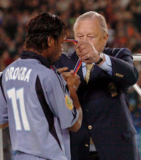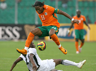 Didier Drogba of Ivory Coast (L) is challenged by Saidou Panandetet09 February 2008, Didier Drogba avoids a tackle ahead of the game Ghana v Ivory Coast , MTN African Cup of Nations, Baba Yara Stadium, Kumasi , Ghana ©Anesh Debiky /Backpagep