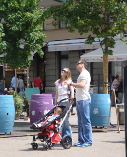 Socceroos captain Mark Viduka with wife and child strolling in the street in Zagreb