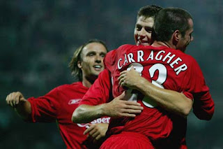KAUNAS, LITHUANIA - JULY 26: Jamie Carragher of Liverpool celebrates his goal with Steven Gerrard during the UEFA Champions League second qualifying round first leg match between FBK Kaunas and Liverpool at Stadium S.Darius & S.Gireno on July 26, 2005 in Kaunas, Lithuania.