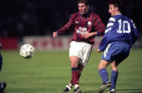 Juventus' Zinedine Zidane of France, left, is tackled by Udinese's Herve Genaux of Belgium during their Italian League soccer match in Turin, Saturday, March 13, 1999. Juventus beat Udinese 2-1.