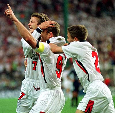 by David Beckham (7) and Sol Campbell after scoring the first English