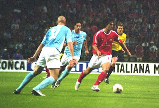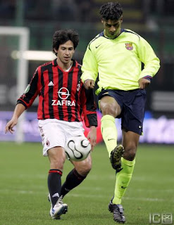 Portugese A.C. Milan midfielder Manuel Rui Costa (C) celebrates with team mates Ivan Brocchi (L) and Demetrio Albertini after scoring against CSKA Sofia during their Uefa cup second round first leg, soccer match at Meazza stadium, in Milan, October 18, 2001.