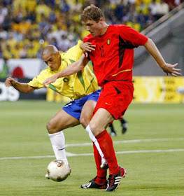 controls the ball ahead of Brazil's Roberto Carlos (L) during their