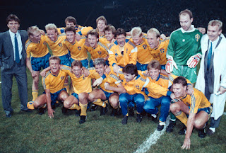 Bakre raden fr-v. Roland Nilsson, Sheffield W, Mikael Nilsson, IFK Göteborg, Magnus Erlingmark , Örebro SK, Johnny Ekström, IFK Göteborg, Patrik Andersson, MAlmö FF, Roger Ljung, Admira Wacker, Jan Eriksson, IFK Norrköping .