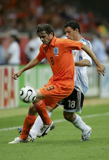 Maxi Rodriguez (front) is challenged by Dutch midfielder Phillip Cocu in