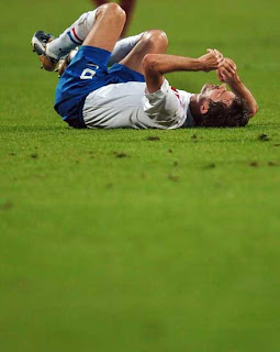 utch midfielder Phillip Cocu lies on the pitch during the World Cup 2006 round of 16 football game Portugal vs. Netherland s, 25 June 2006 at Nuremberg stadium