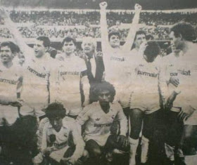 Real Betis 1981/82. En la imagen arriba: Montiel, Soto, Moyano, Peruena, Salva, Diarte, Francis, Quico, Esnaola, Alex, Carmelo, Tello, Gordillo, Barroso y Rogelio; abajo: Biosca, Ortega, Cardeñosa, Ramón, López, Rincón, Iriondo, Casado, Parra, Bizcocho y Benítez.