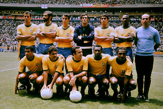Brazil World Cup Team. Back Row L-R: Carlos Alberto, Brito, Wilson Piazza, Felix, Clodoaldo, Everaldo, Mario Zagalo. Front Row L-R: Jairzinho, Roberto Rivelino, Tostao, Pele, Paulo Cesar