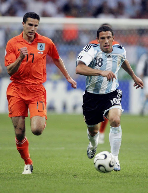 Robin Van Persie of the Netherland s and Maxi Rodriguez of Argentina chase the loose ball during the FIFA World Cup Germany 2006 Group C match between Netherland s and Argentina at the Stadium Frankfurt on June 21, 2006 in Frankfurt, Germany.