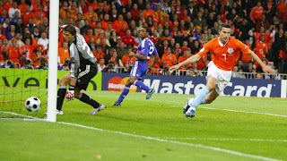Dutch forward Robin van Persie (R) scores a goal against French goalkeeper Gregory Coupet during the Euro 2008 Championsh ips Group C football match Netherland s vs. France on June 13, 2008