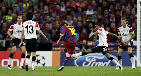 Barcelona´ s midfielder Lionel Messi (R) vies with Manchester 's
