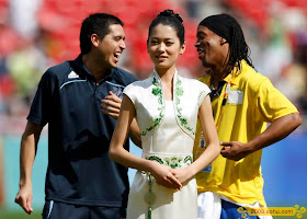 Brazil's Ronaldinho (R) speaks with Argentina'